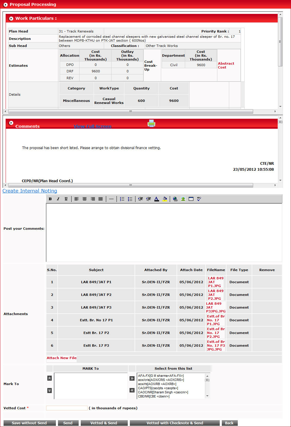 After clicking above highlighted Name of Work, Proposal Processing window will open on the screen.